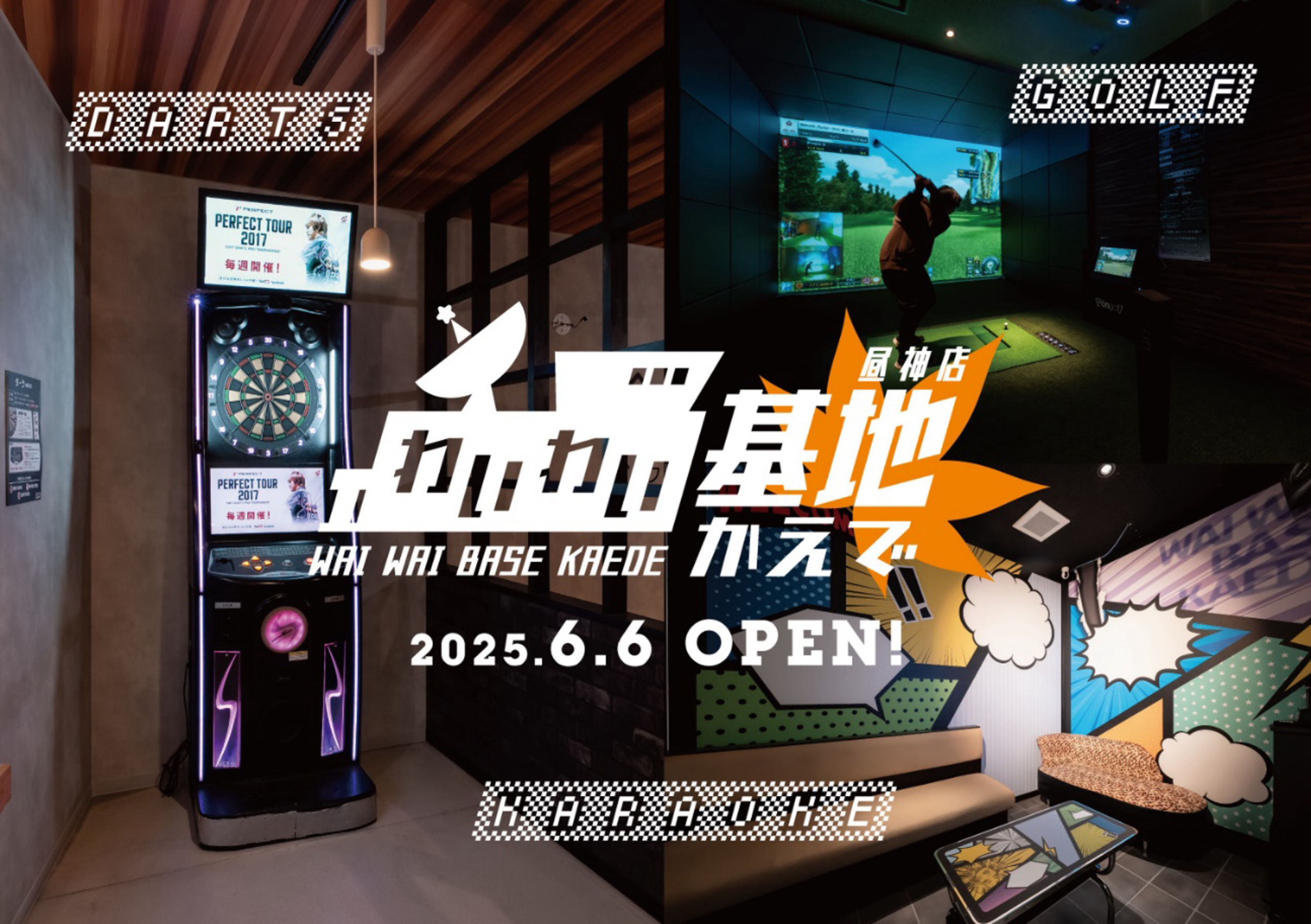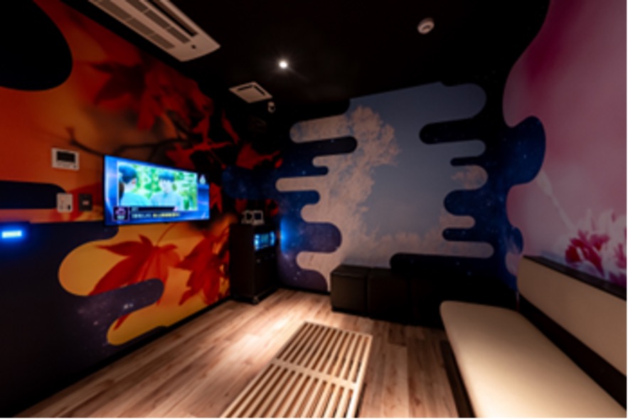 ACHI BASEの地下に遊びと癒しが融合したアミューズメントエリア「わいわい基地かえで 昼神店」をオープンします。カラオケ、シュミレーションゴルフ、ダーツなど最新のアクティビティが楽しめます。すべてのプランにフリードリンクがついており、別料金でアルコールバーも完備しております。また、当施設ではQRコードを使った入場システムを導入しており、各部屋の利用、各エリアの利用もQRコードひとつでスムーズに行うことができます。
